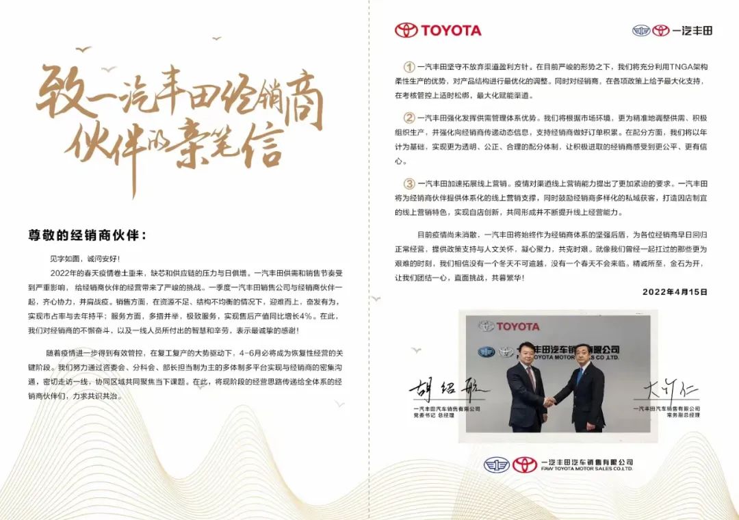 日前,一汽豐田銷售公司黨委書記、總經理胡紹航給經銷商群體發(fā)出了一份公開信,他在信中寫道:“盡管困難遠超出預期,但我們相信,只要萬眾同心共克時艱,方法就總比困難多!”