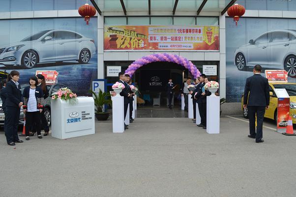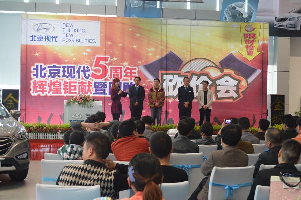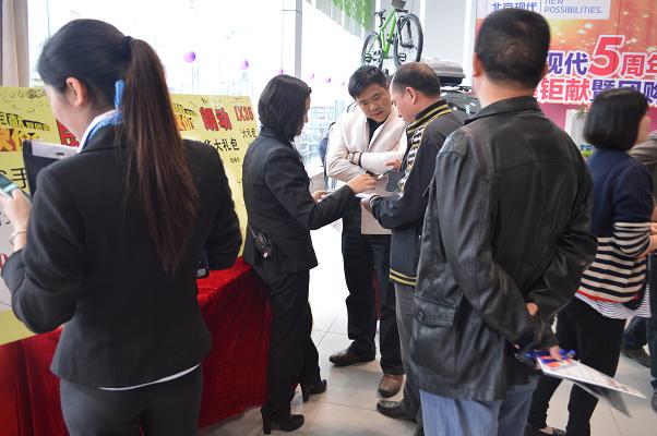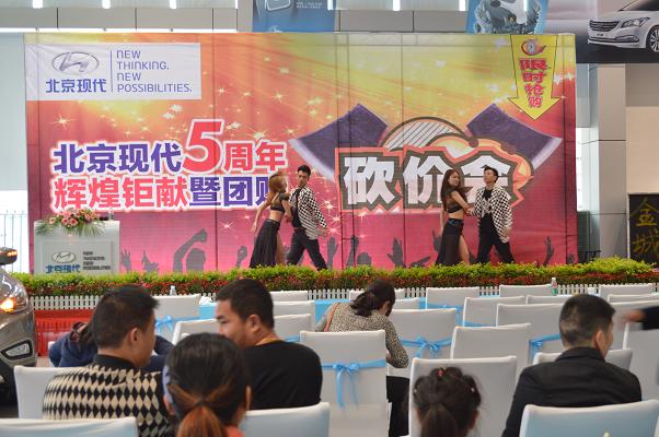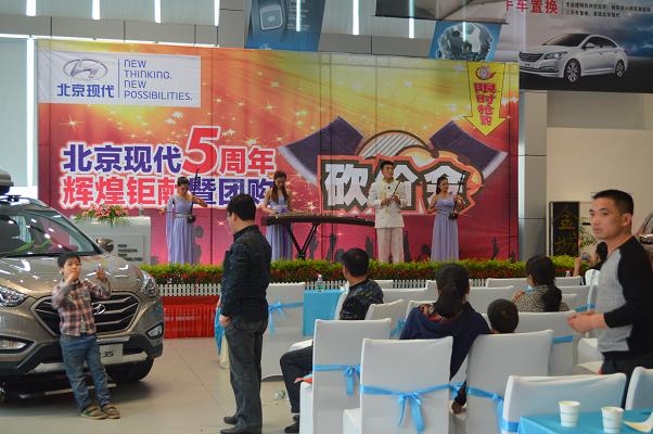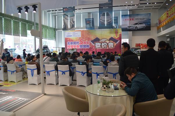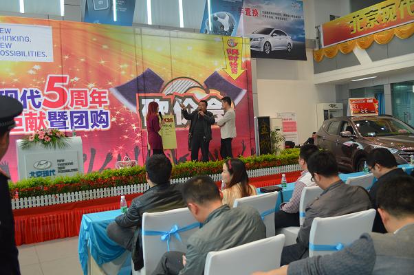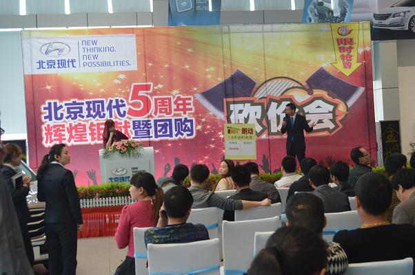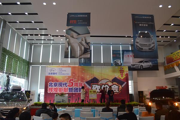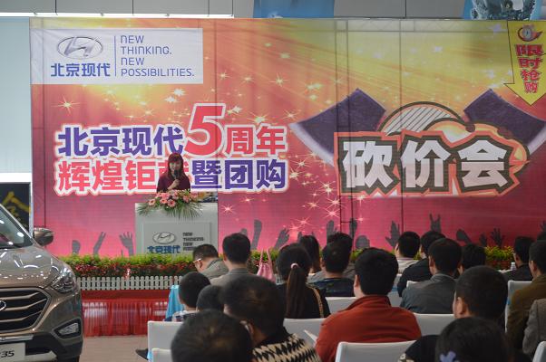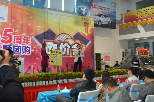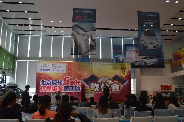 4月13日北京現(xiàn)代邵陽(天嬌)寶京4S店成立5周年,為答謝新老客戶的厚愛推出大型“團購砍價會”活動。
