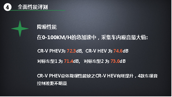 雖然不屬于主要的關(guān)注點(diǎn),但我們還是對性能層面進(jìn)行了測試。對應(yīng)的結(jié)果是,除了百公里加速,其他各項(xiàng)測試成績都是CR-V銳·混動e+最優(yōu)。